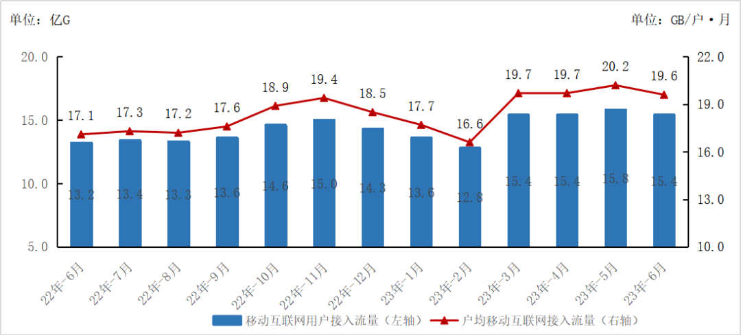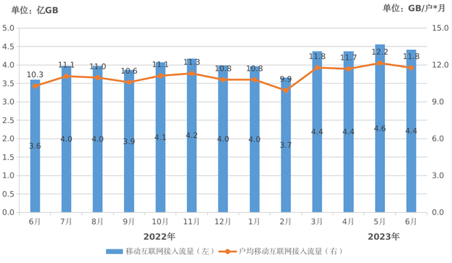 移动互联网流量小幅增长,6月户均移动互联网接入流量(DOU)较上月小幅回落。1-6月,移动互联网累计流量达25.3亿GB,同比增长13.6%。6月当月DOU为11.8GB/户·月,较上月回落0.4GB/户·月,较上年同期增长14.5%。
