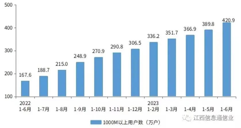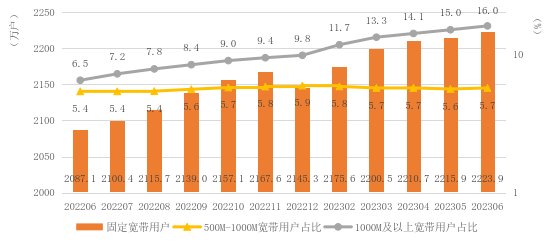 固定宽带用户向高速率迁转,千兆宽带用户保持三位数以上高速增长。截至6月底,全省固定宽带用户达2223.9万户,同比增长6.6%。其中,速率在500M和1000M之间的宽带用户125.9万户,同比增长12%,占总用户数的5.7%;速率在1000M及以上的宽带用户356.9万户,同比增长164.1%,占比16%。