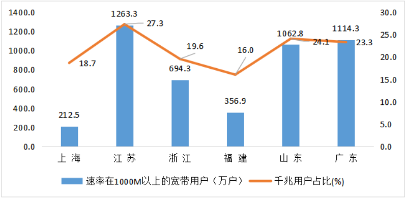 全省1000Mbps以上速率的用户比上年末净增47.5万户,总数达165.7万户,占宽带用户总数的10.2%,比上年末提升2.7个百分点。