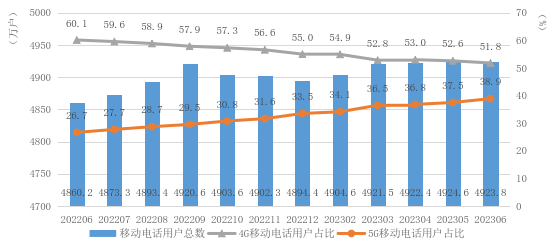(二)移动电话用户规模持续扩大,5G用户占比快速提升。全省移动电话用户总数达4802.2万户,同比增长5.4%,比上年末净增107.6万户。其中,5G移动用户数达1953.1万户,居全国第13位,占移动电话用户的40.7%,居全国第8位,高于全国平均水平1.2个百分点。