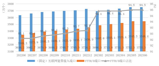固定宽带接入端口总数为10147.8万个,其中FTTH/O端口数为9802.8万个,占固定宽带接入端口的比例为96.6%。