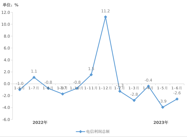 移动数据流量业务收入负增长。1-6月,全省移动数据流量业务收入107.2亿元,同比下降2.3%,在电信业务收入中占比为39.1%,拉低电信业务收入增长0.9个百分点。