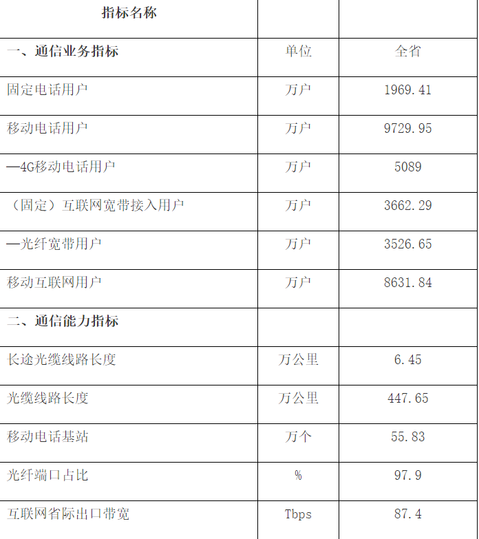 (二)千兆光纤网络建设稳步推进。全省固定互联网宽带接入端口数达2804.3万个,其中光纤接入(FTTH/0)端口达到2729.3万个,占固定互联网接入端口的97.3%,高于全国平均水平。全省具备千兆网络服务能力的端口达49.9万个,比上年末净增9.6万个,实现了千兆光网“村村通”。