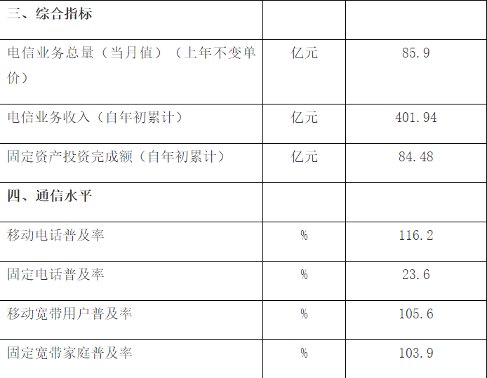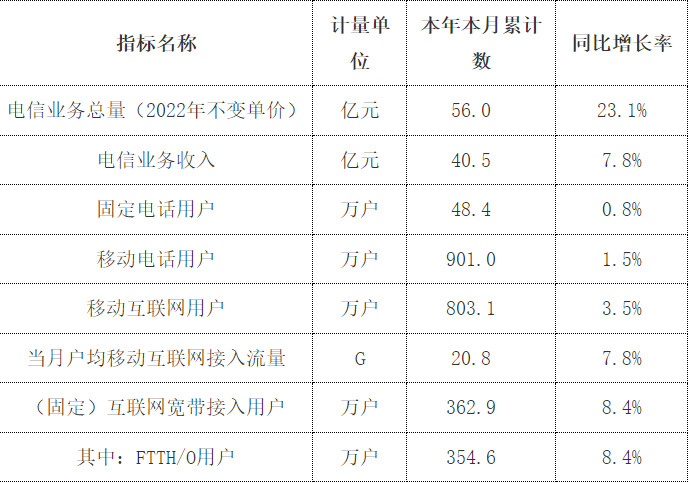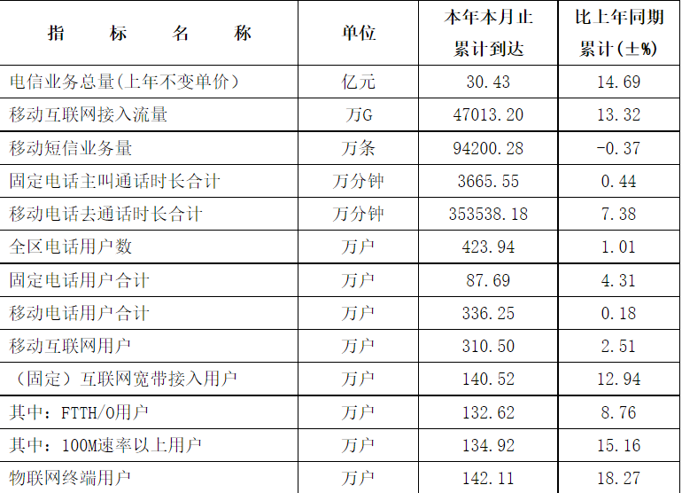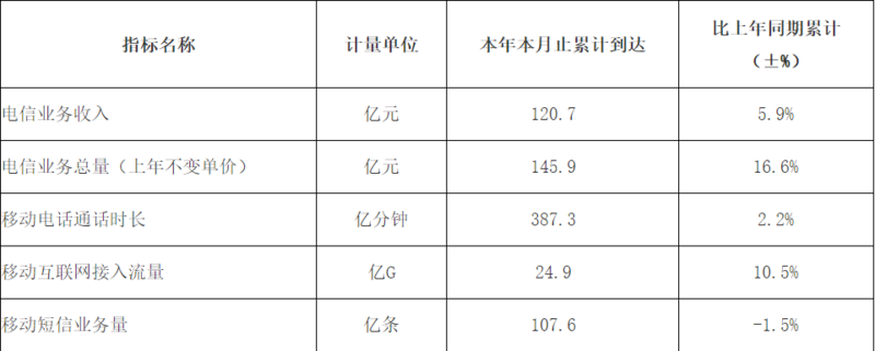 固定主叫通话时长累计达62.1亿分钟,同比增长8.8%;移动来去话通话时长累计达1815.9亿分钟,同比减少4.2%。移动短信业务量累计达981.6亿条,同比增长3%。