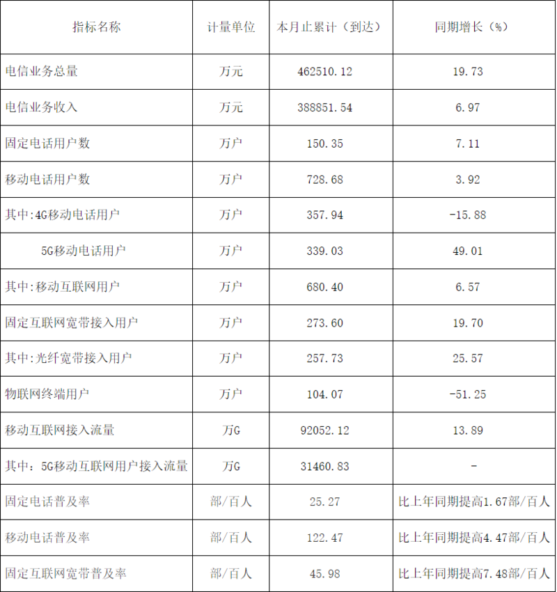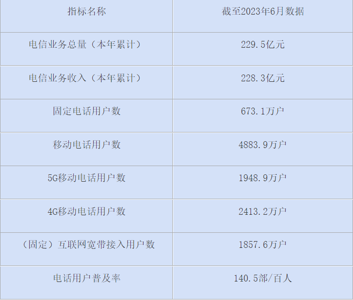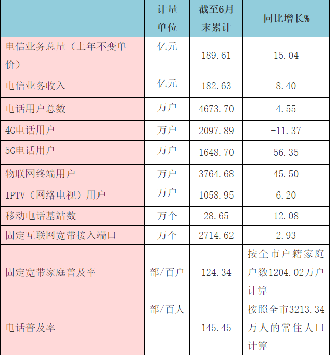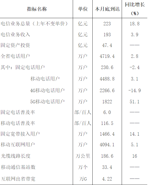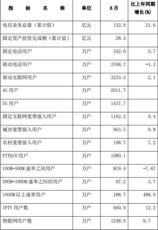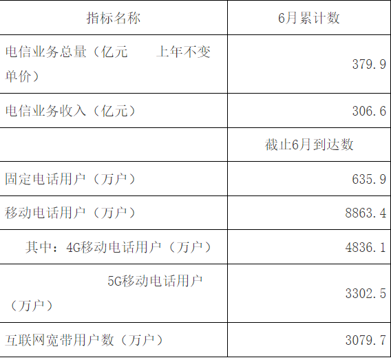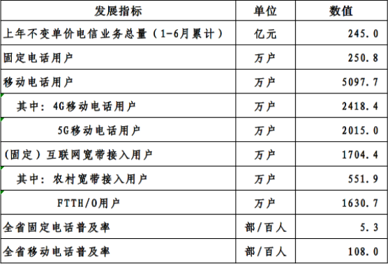 截至6月底,全省固定电话用户比上年末减少12.2万户,总数达574.1万户,同比下降2.9%。全省移动电话用户比上年末净增48.7万户,总数达5149.6万户,同比增长2.6%,其中,5G移动电话用户比上年末净增342.3万户,总数达1827.3万户,同比增长49.9%。