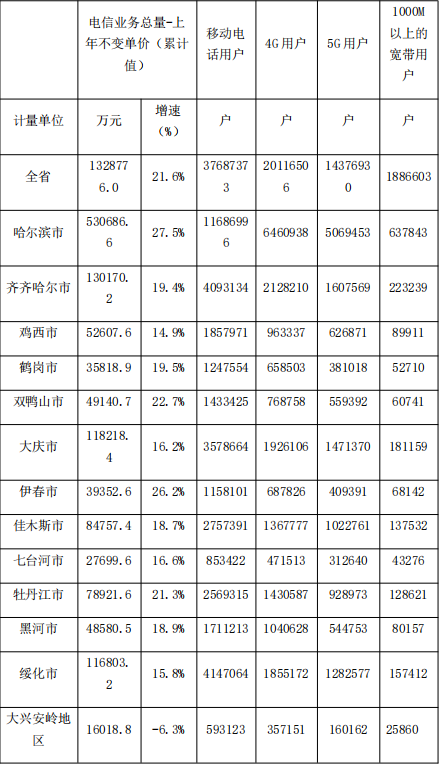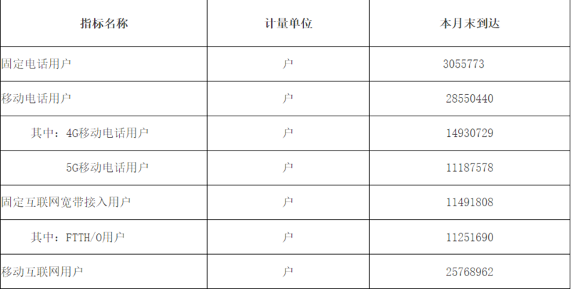 固定宽带用户:固定宽带用户4779.1万户,其中FTTH/O用户4541.3万户;500M以上用户1562.2万户;千兆以上用户总数达1114.3万户,较上年底增加268.5万户,占比为23.3%。