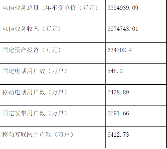 电话用户数1.89亿户,固定、移动电话用户数分别为1847.6万户、17059.6万户。