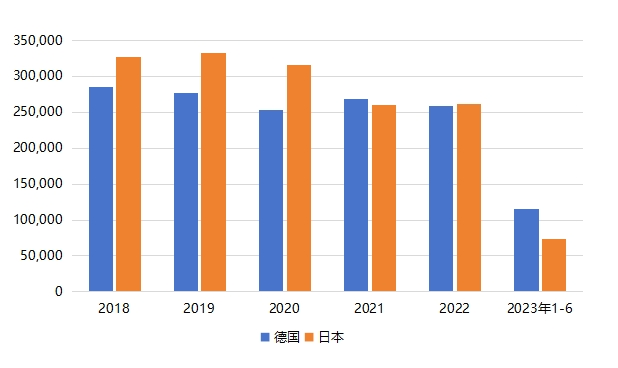图7 2018-2023年上半年中国从日本和德国进口汽车对比情况