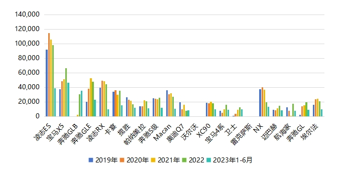2022年,进口汽车车型的前六名分别是:凌志ES、宝马X5、奔驰GLE、凌志RX、卡宴和奔驰GLB,这六款车型进口占比分别是:17.6%、11.8%、8.6%、8%、6.4%和5.4%。