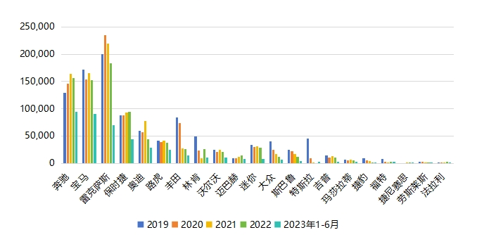 图9 2019-2023年上半年中国进口汽车按品牌统计的情况