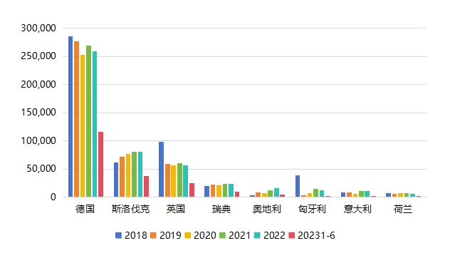 图8 2018-2023年上半年中国从欧洲国家进口汽车的情况