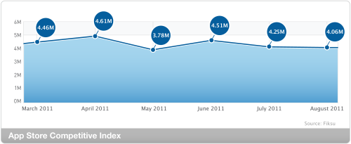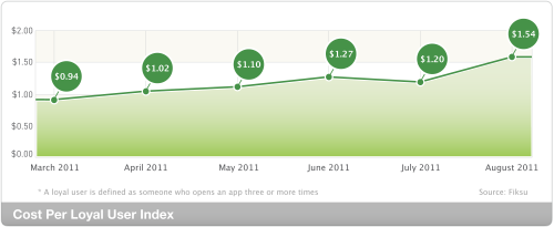 Fiksu公司最新分析结果表明,由于用户下载的iOS应用数量减少,2011年8月应用开发者获取每名忠实用户(注:这里指下载后至少访问三次应用的用户)的营销成本上升,从7月份的1.2美元增长至1.57美元。