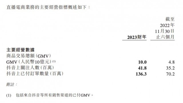 2023财年,东方甄选全年带货GMV达到100亿元,来自抖音的GMV占绝大部分,于抖音上第三方产品及自营产品的已付订单总数为136.3百万单。