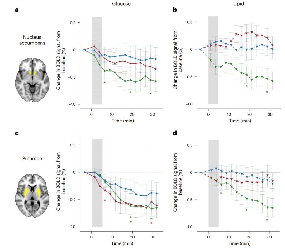 结果显示,对照组的正常体重参与者被灌胃葡萄糖溶液后,纹状体、额叶、岛叶、边缘区、枕叶、顶叶、颞叶等区域的神经活动信号均降低,随后伏隔核、壳核和额极也有变化;而在灌胃脂质溶液后,研究者观察到健康参与者的额叶、岛叶、边缘区、顶叶和颞叶区域的神经活动信号出现下降的情况,此外,还在枕叶观察到了延迟反应。