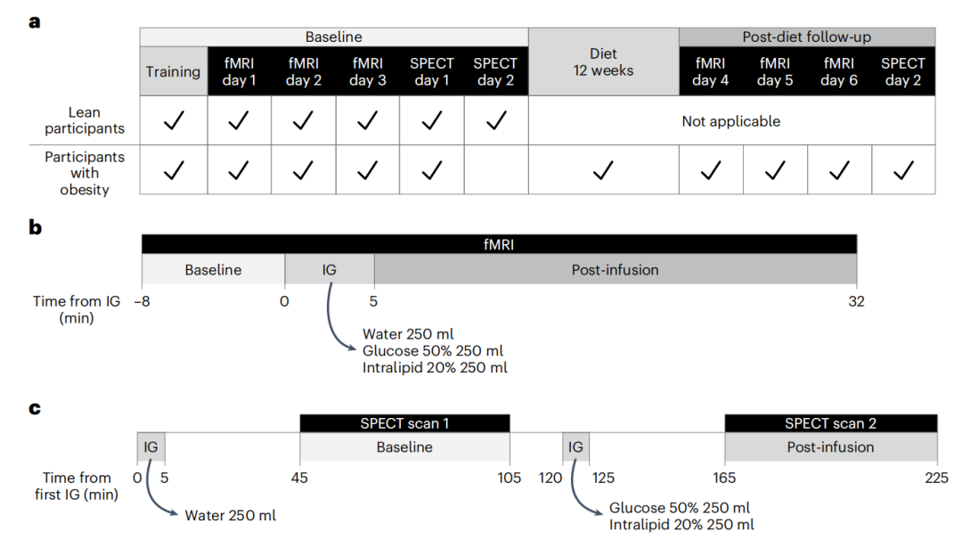 为了弥补空缺,来自阿姆斯特丹大学医学中心和耶鲁大学的研究团队设计了一项随机对照试验。研究者筛选出30名体重健康的参与者和30名肥胖症患者,向其胃中注射特定的营养物质,包括葡萄糖溶液、脂质溶液、以及无热量的水。