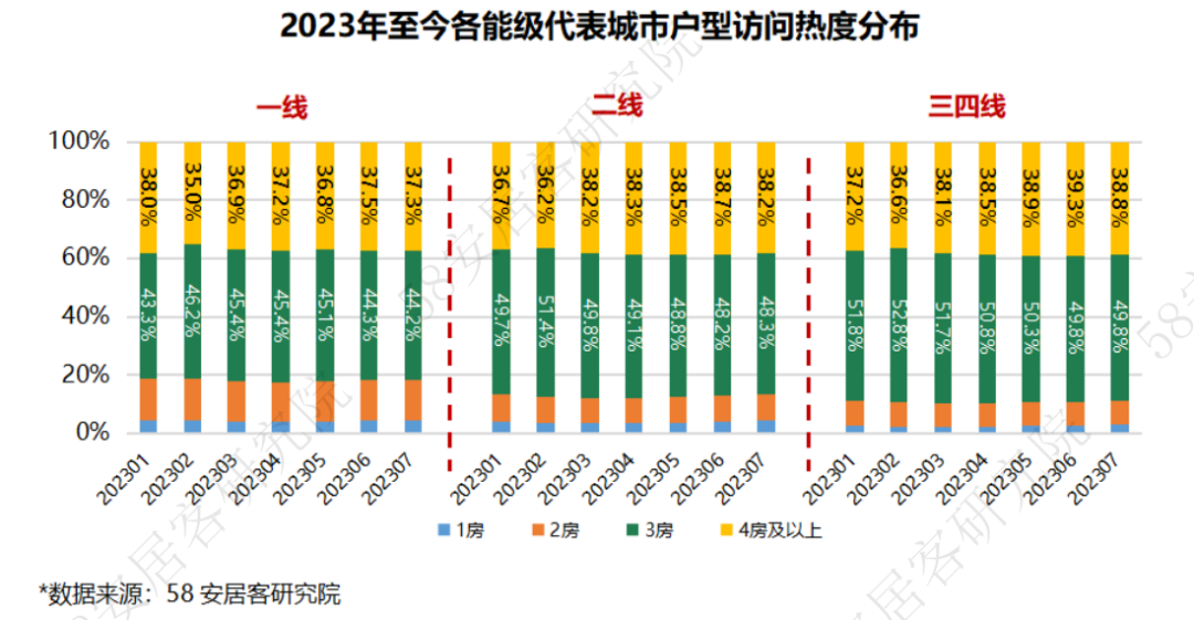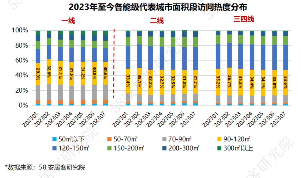 一线城市本月3室及以上户型找房热度占略有下降,反之,2室及以下户型热度有所反弹。结合面积段来看,90-150平方米户型热度占比微降,90平方米以下和150平方米以上的面积段热度占比微升;二线城市4房及以上、150平方米面积以上户型占比微降,其他户型热度占比微增;三四线城市4房及以上、90-200平方米户型热度占比微降,其他户型热度占比上升。