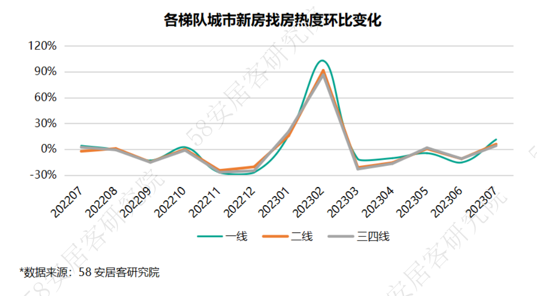 7月,各梯队城市新房找房热度均有一定比例的反弹,其中一线城市热度反弹最大。具体来看,一线城市新房找房热度环比上升11.2%,四个一线城市较上月热度均有所上升,其中深圳增长幅度最大。二线重点城市上半年新房找房热度环比上涨5.8%,成都、无锡、大连、贵阳等城市线上找房热度环比涨幅较大。三四线重点城市新房找房热度环比上涨3.9%。受季节性影响,威海、秦皇岛等北方旅游城市热度有所反弹。
