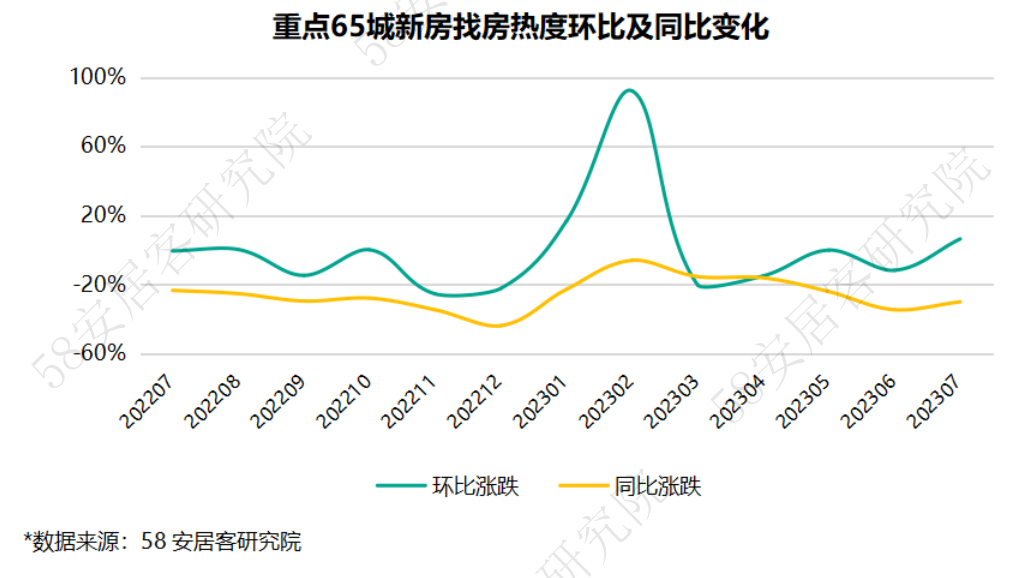 同比来看,从2022年下半年至今,新房找房热度仍处于持续下跌趋势中。尽管今年1季度小阳春带动热度同比跌幅收窄,但到目前看,市场较去年同期降温的趋势并未改变,7月份仍然延续一年来的持续下跌走势。