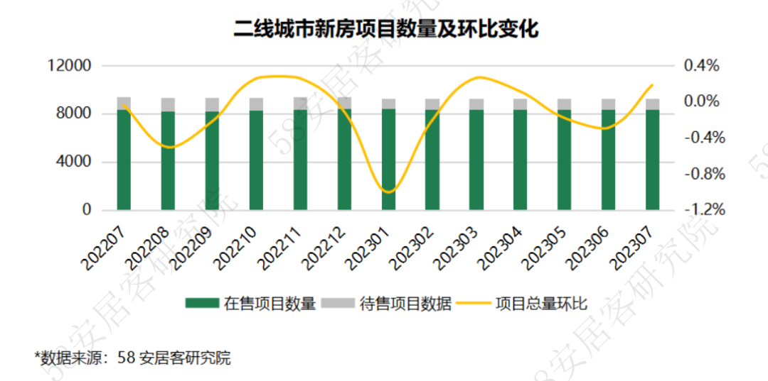 二线代表城市7月新房项目总量基本保持不变,其中在售项目数量保持稳定,待售项目本月增长约1.6%,显示多数二线城市开盘积极性减弱,但仍是开发商重视储备的地区。