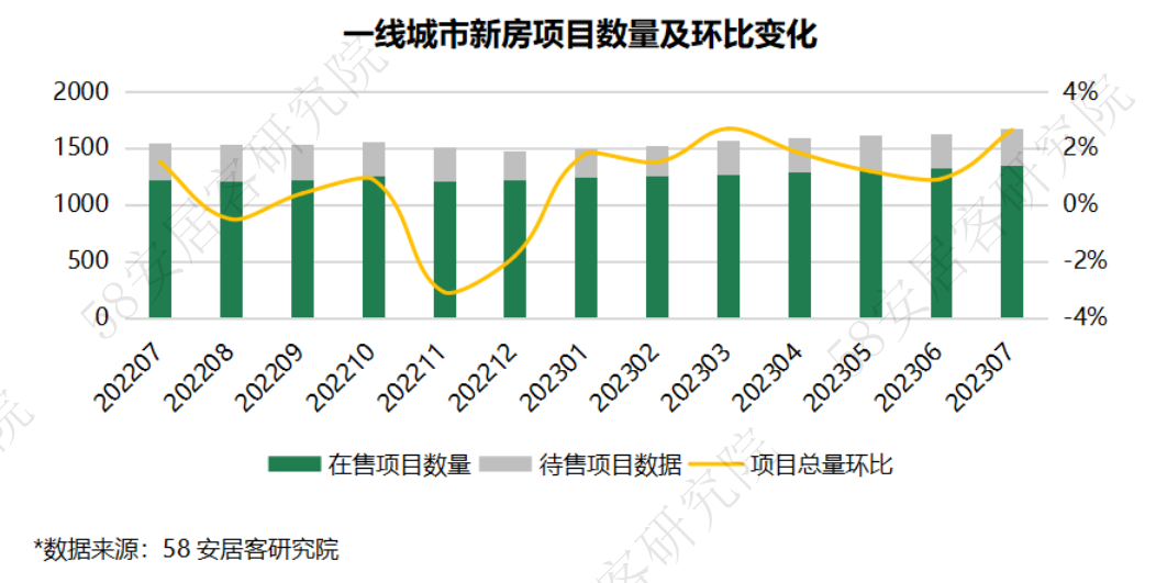 Ø 项目数量:7月新房项目总量环比微增0.4%,主要是由于待售项目环比增长1.4%,总体上市节奏放缓;一线城市项目增长最多。