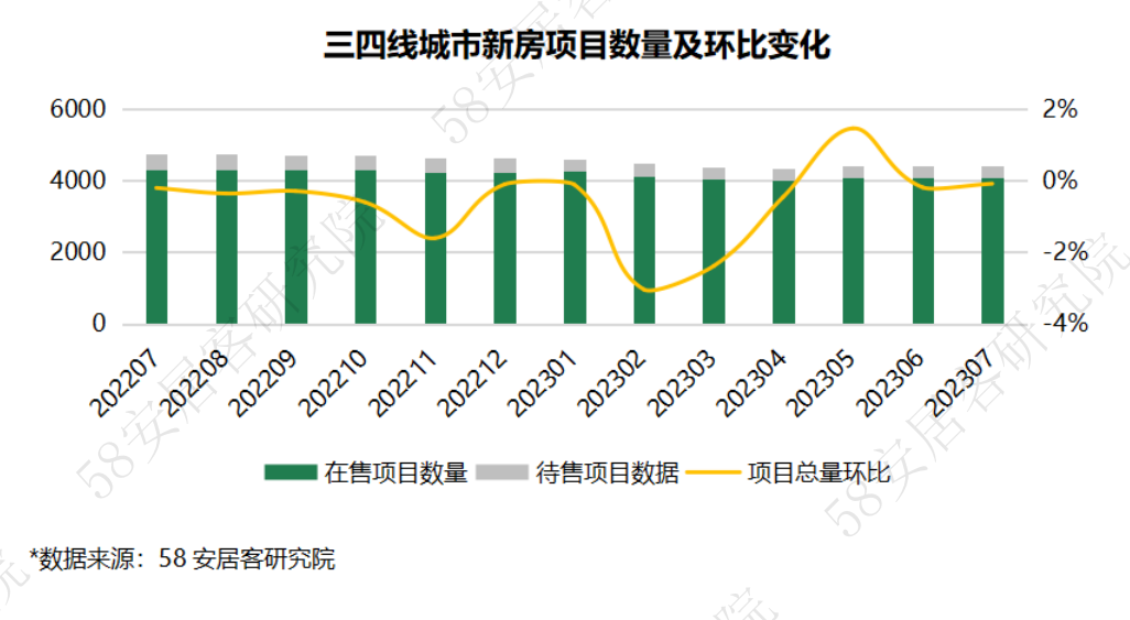 7月份,三四线代表城市新房项目数量与上月基本持平,在售项目和待售项目均无明显增减,这说明开发商布局三四线的项目上市意愿减弱,重新投资三四线的意愿有所降低,新增投资项目也在减少。