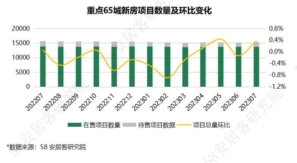 7月,重点65城新房项目总量环比微增0.4%,主要是由于待售项目环比增长1.4%,总体供应节奏放缓,当月在售项目也有少量增长,成交难度也加大,市场整体进入平淡期。