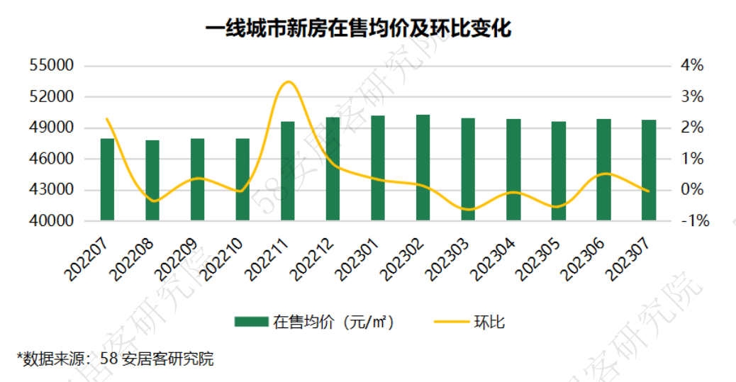 一线城市整体新房在售均价7月环比微跌0.05%,深圳、北京售价下跌,上海和广州新房售价均实现环比上涨,主要是由于城市的供应结构中,部分市区项目带动整体均价上扬。