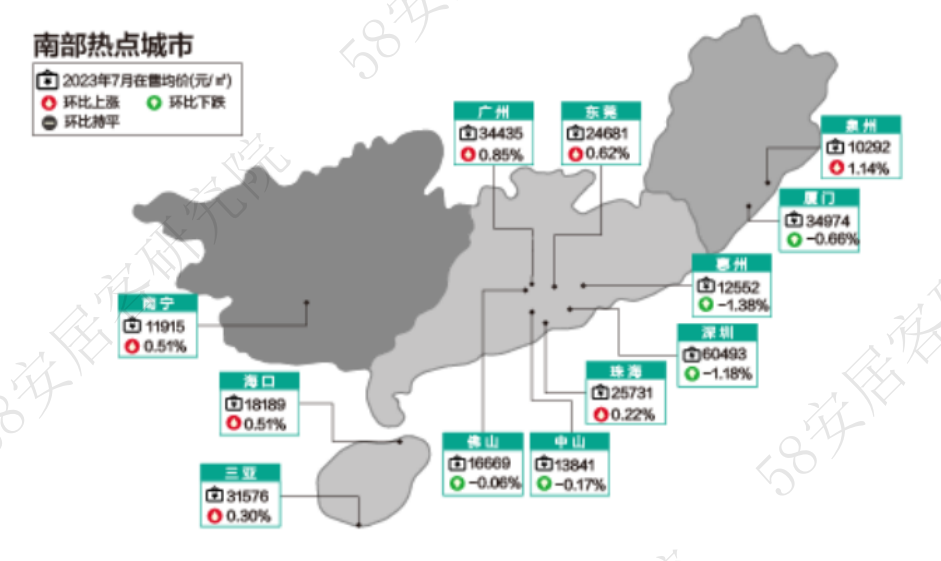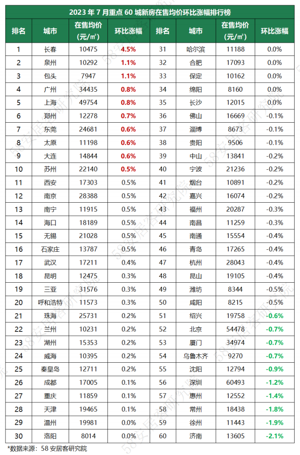 7月,二线城市新房在售均价环比小幅上升0.18%,城市之间分化明显,其中11个城市房价上涨,22个城市房价下跌。济南新房售价下跌幅度约2%,在二线城市中跌幅最大,长春涨幅最大,约为4%。
