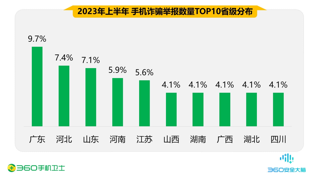 报告显示,在地域分布上广东成诈骗“重灾区”,占用户举报数量的9.7%。其次为河北省和山东省,占比分别为7.4%和7.1%。报告还显示,各城市诈骗的举报情况方面,北京受骗用户最多。