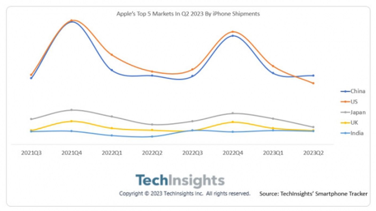 据说第二季度美国智能手机市场的低迷是由于消费者期待今年下半年推出新款 iPhone 而推迟购买新手机的心理造成的。不过,TechInsight 表示,其结果同时反映了”中国[日益增长的]经济实力、蓬勃发展的中产阶级以及中国消费者对高端手机的偏好”。