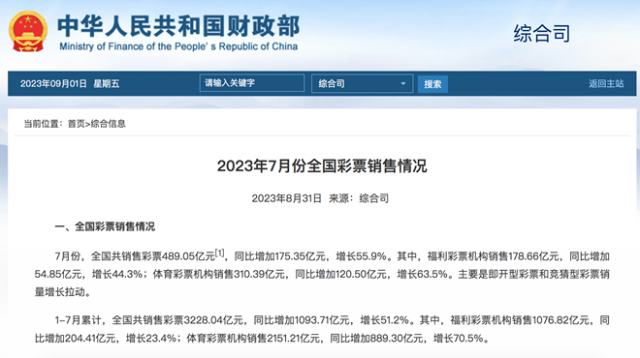 据财政部官网披露的数据显示,2023年7月份,全国共销售彩票489.05亿元,同比增加175.35亿元,增长55.9%。其中,福利彩票机构销售178.66亿元,同比增加54.85亿元,增长44.3%;体育彩票机构销售310.39亿元,同比增加120.50亿元,增长63.5%。主要是即开型彩票和竞猜型彩票销量增长拉动。
