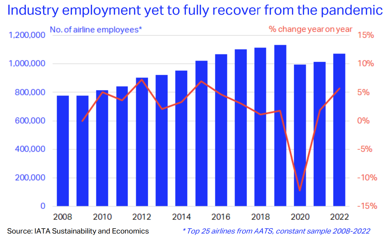 在许多国家失业率普遍很低的背景下,航空公司(以及更广泛的价值链)的就业复苏并不总是一帆风顺。一些航空公司不同程度地报告了工资压力,以及持续的劳动力和技能短缺。有时,这影响了该行业适应需求复苏步伐的能力。