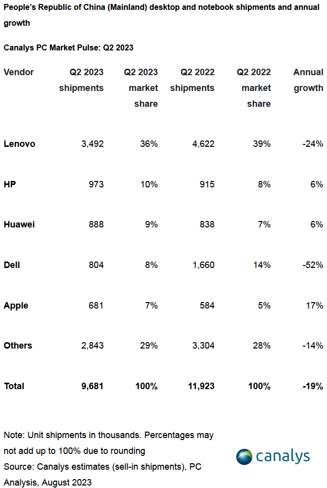 中国大陆PC市场在2023年第二季度因经济挑战而下滑