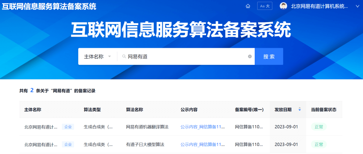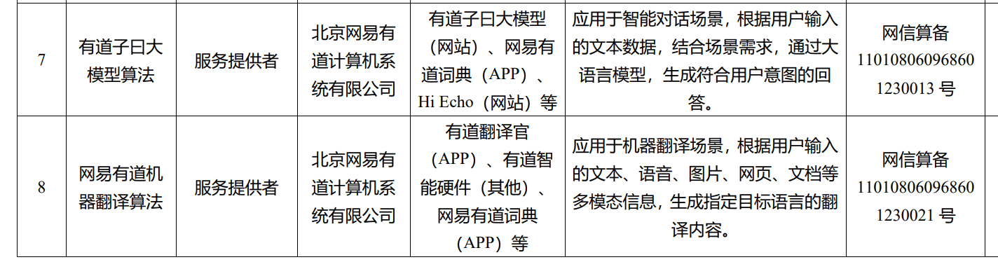 9月1日,国家互联网信息办公室发布了境内第二批深度合成服务算法备案信息公告,网易有道旗下的“子曰”大模型及网易有道词典、有道虚拟人口语教练 Hi Echo、有道翻译、有道智能硬件等多个基于“子曰”大模型的应用程序及产品,均被纳入“境内深度合成服务算法备案清单(2023 年 8 月)”。