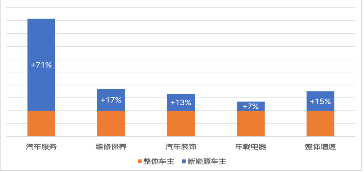 从整体消费金额来看,新能源车主用户在汽车用品和服务上同比增速高出整体水平15个百分点,其中汽车服务成交同比增速领先整体车主71%,汽车装饰(用品)增速领先13%,维修保养增速领先17%。