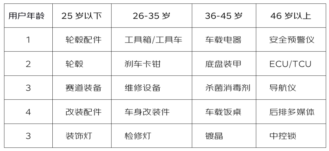 而随着年龄的增长,对用车的实用性、安全性和舒适性的的要求逐步提升,如36-45岁的用户更偏爱车载电器及安全和保养用品,46岁以上对安全预警仪、导航仪和后排多媒体等安全和舒适设备给予了更多的偏爱。
