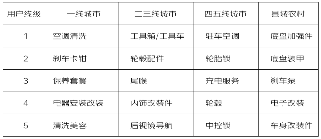 表2: 不同线级新能源车主汽车用品和服务消费偏好TOP5