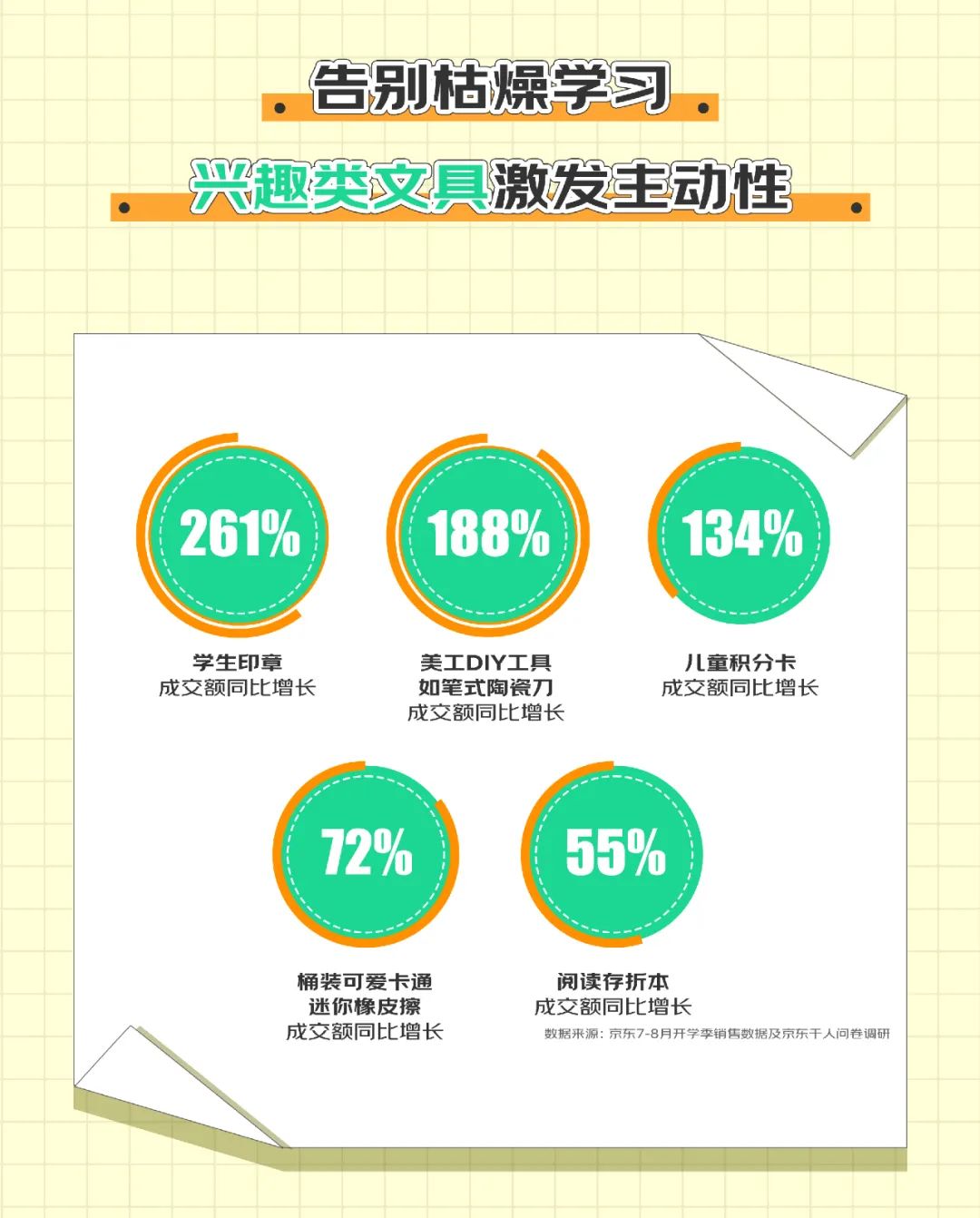 京东 7-8 月开学季期间,能提高写名字效率的学生印章成交额同比增长 261%;学习之余,用画画、雕塑培养艺术审美,放松身心,美工 DIY 工具,如笔式陶瓷刀成交额同比增长 188%。孩子学习需要激励也是家长们的共识,儿童积分卡成交额同比增长 134%。可爱的文具能唤起孩子们的兴趣,桶装可爱卡通迷你橡皮擦成交额同比增长 72%。亲子阅读好处颇多,阅读存折本成交额同比增长 55%。