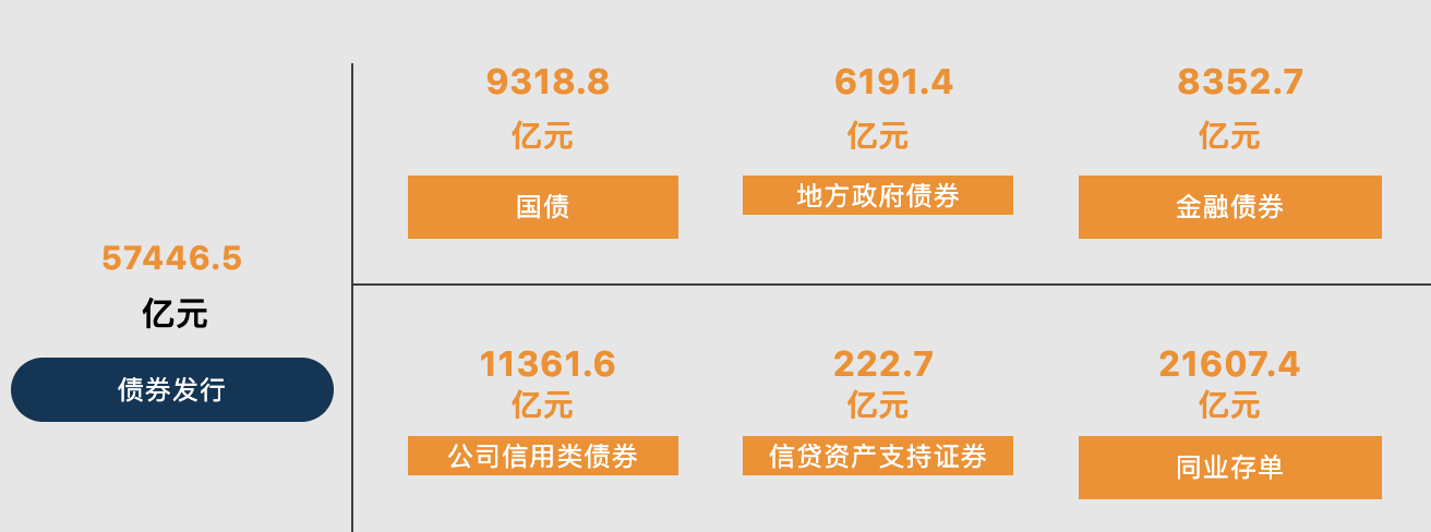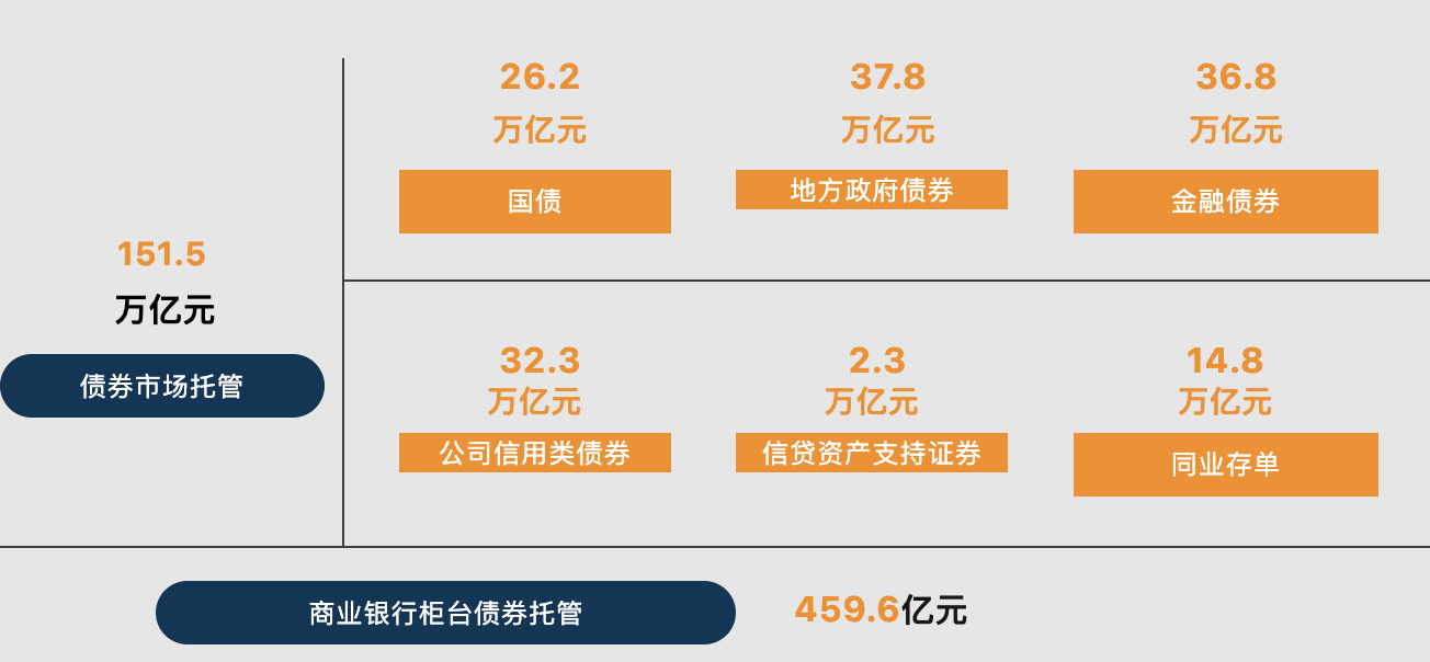 截至7月末,债券市场托管余额为151.5万亿元。其中,银行间市场托管余额131.4万亿元,交易所市场托管余额20.1万亿元。分券种来看,国债托管余额26.2万亿元,地方政府债券托管余额37.8万亿元,金融债券托管余额36.8万亿元,公司信用类债券托管余额32.3万亿元,信贷资产支持证券托管余额2.3万亿元,同业存单托管余额14.8万亿元。商业银行柜台债券托管余额459.6亿元。