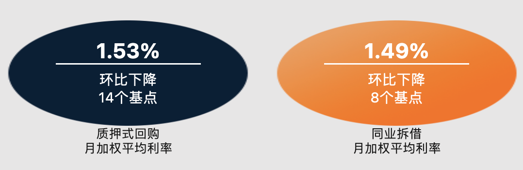 7月份,银行间质押式回购月加权平均利率为1.53%,环比下降14个基点;同业拆借月加权平均利率为1.49%,环比下降8个基点。