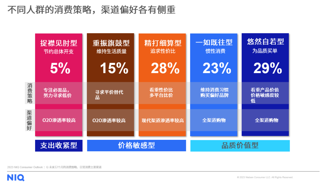 从消费策略看,我们看到消费行为也有所变化。价格敏感型消费者主张钱要花在刀刃上,选择采用不同方式保证生活质量;品质价值型消费者关注可持续发展,愿意为价值买单;而悠然自若型则对可持续发展需求更为迫切。