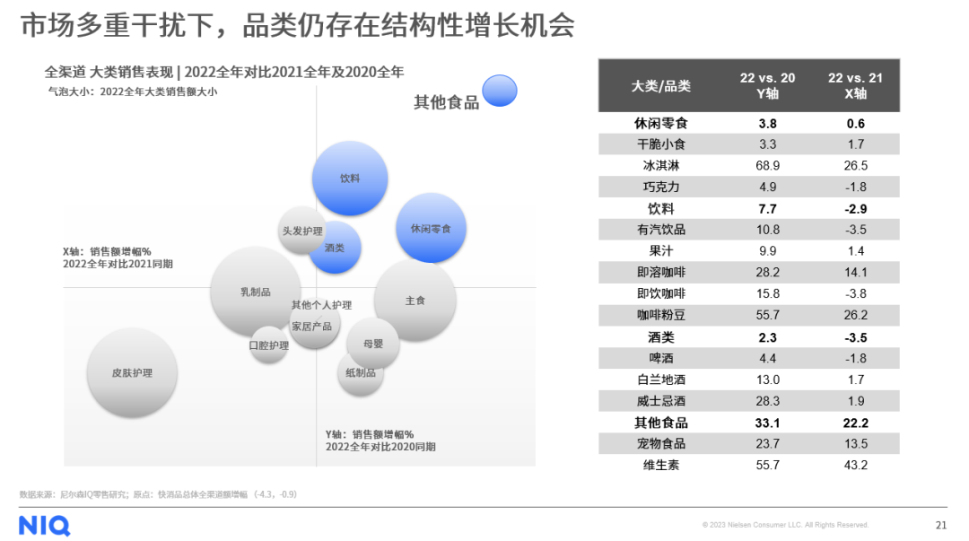 在这样的渠道变革当中,哪些品类受益?下图中,我们列出了近两年主要快消品品类的增速,球的大小代表品类的体量,横轴是今年比去年的销售额增速,纵轴为去年比前年的销售额增速,右上角蓝色部分表示这两年增速超平均值的品类。图中可以看到,过去两年增速较快的主要是休闲零食、食品饮料品类。