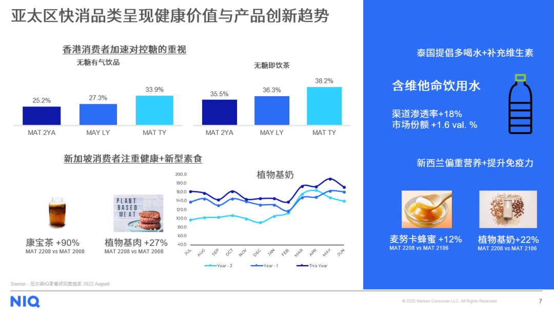 聚焦健康趋势,我们发现,中国消费者与全球其他地区、亚太其他地区的消费者相比,对健康的理解和需求有所不同。例如,在东南亚,素食类和植物基类的的产品有所增加。近两年,植物基概念食品在国内较为热门,但整体热度较之前有所回落。