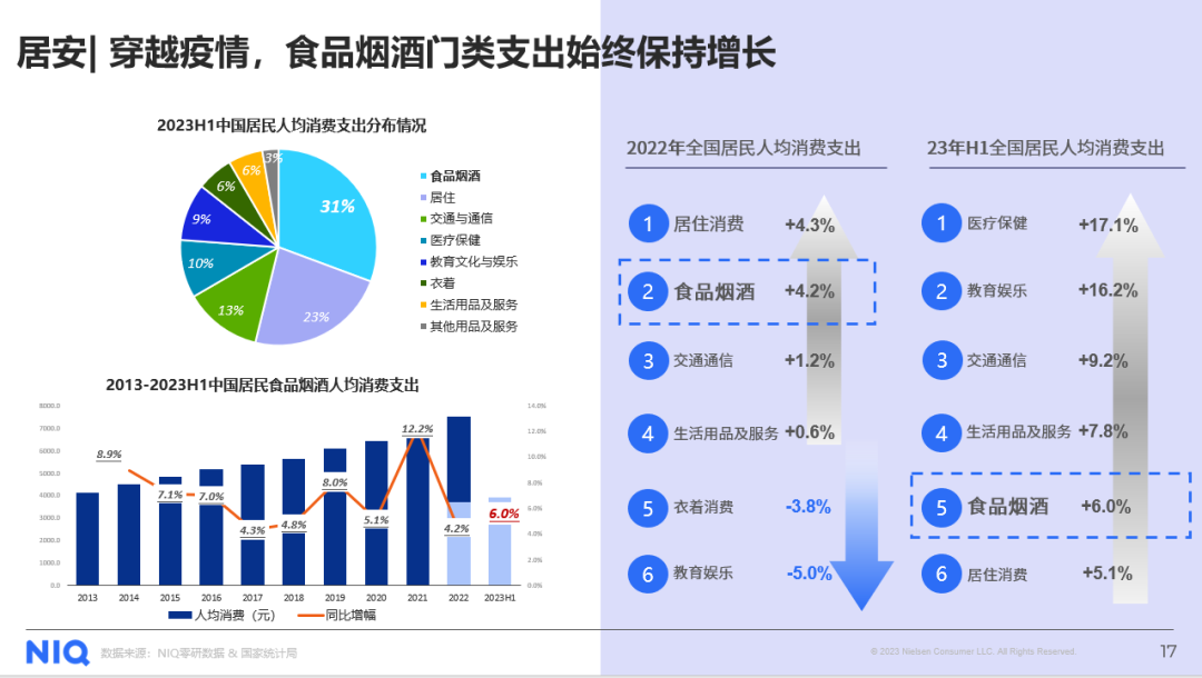 就居民人均消费支出而言,食品烟酒支出在近几年保持持续性增长,2022年居民人均消费重要性中位列第二。疫情开放后,消费者在交通通信、教育娱乐等领域的消费增速进一步提升,食品烟酒的消费支出增速放缓。