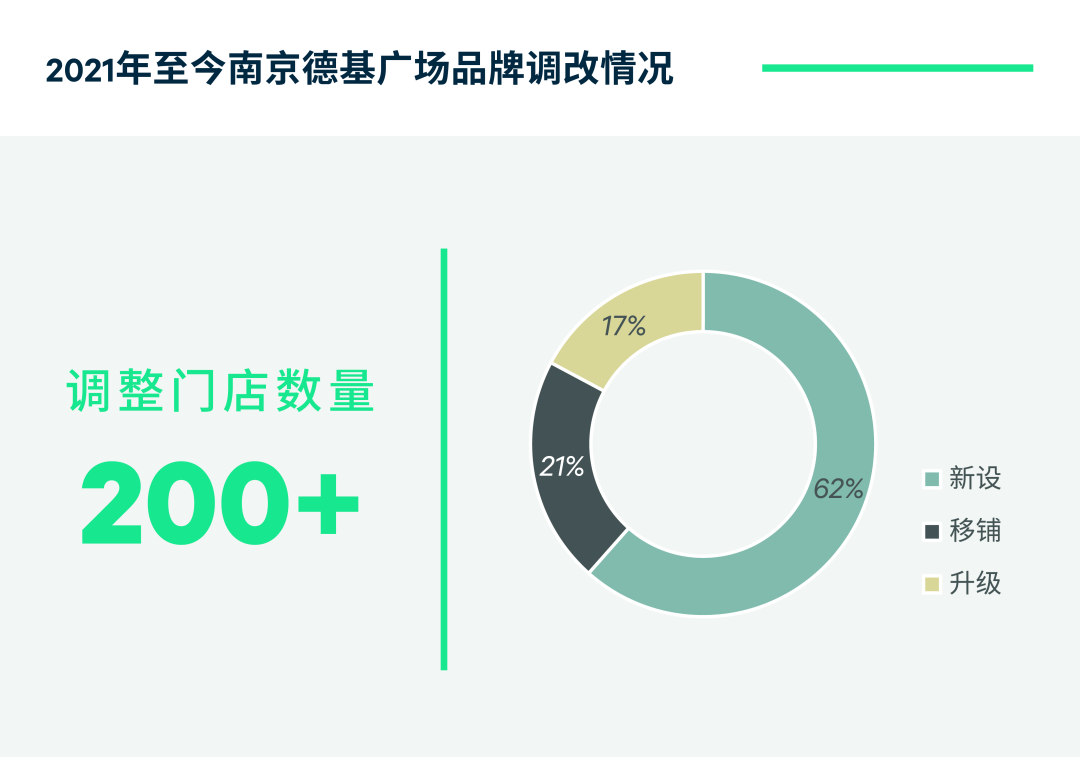 提及高端零售物业,位于中华第一商圈新街口板块的德基广场在全国范围名列前茅,其销售额自2018年首次录得100亿元至2021年突破200亿元,仅用了三年时间,而在2022年凭借210亿元的亮眼表现在全国购物中心销售额排行榜上稳居次席,成为华东地区唯一挺进“二百亿俱乐部”的商业项目。作为目前南京仅有的在营高端零售项目,德基广场针对升级迭代的高端消费需求持续进行积极且精准的品牌调整,致使其涵盖奢侈品品牌的广度与深度不断强化。据CBRE研究部统计,自2021年德基广场启动新一轮调改以来,调整门店超200家,新店引入数量占比逾60%,其中约三分之一为城市级别及以上首店,如罗意威香氛、梵诗柯香、赫芮亚美妆等高端香化品牌高能级首店相继落位负一层;同时,门店品牌升级数量占比为17%,包括四大顶奢在内的众多奢侈品牌相继扩店为更高规格的多层旗舰店,多个珠宝腕表品牌亦在此期间完成升级提档。