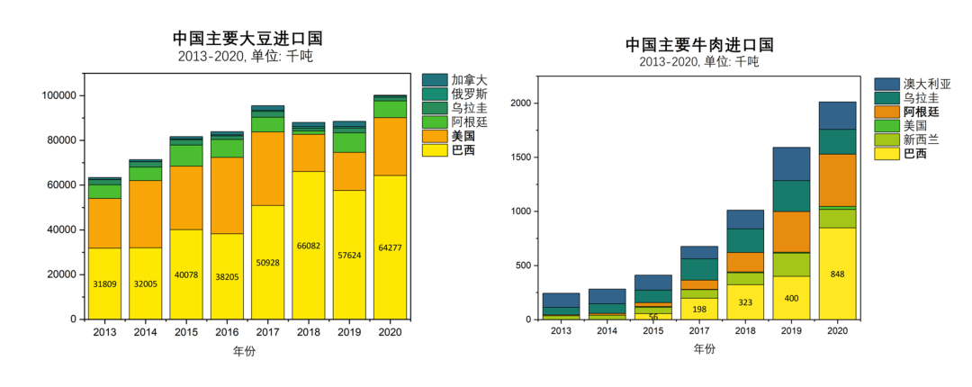 自2009年以来,中国已连续14年成为巴西最大的贸易伙伴。2022年,两国双边贸易额达到1714.9亿美元,同比增长4.9%。中国当前是巴西大豆、牛肉、鸡肉、猪肉等农产品的最大进口国。据中国海关统计,2022年中国进口大豆9108万吨,其中有5440万吨来自巴西,占总进口量的近60%;此外,中国还进口了269万吨牛肉,其中巴西牛肉有111万吨,占总进口量的41%。