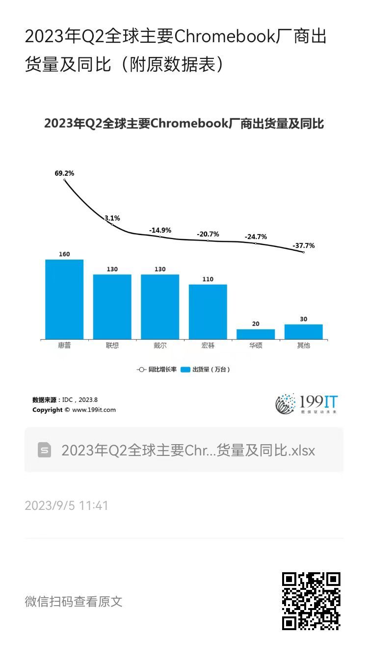 - 2023年Q2全球主要Chromebook厂商出货量市场份额(附原数据表)