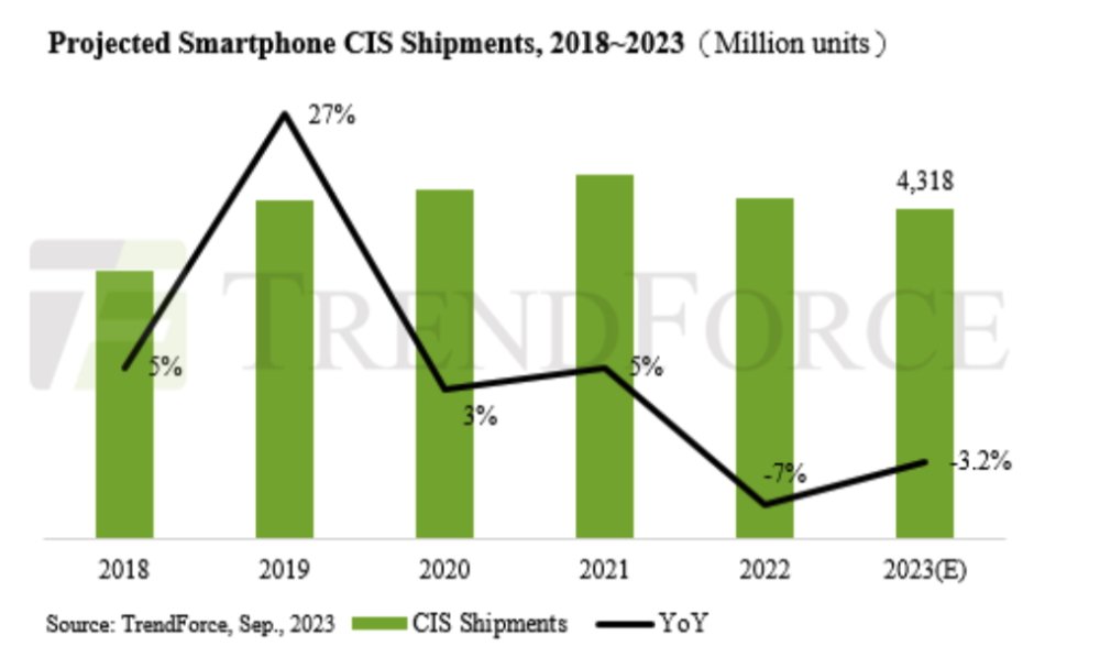 Trendforce 援引了智能手机中使用的 CMOS 图像传感器(CIS)全球出货量的估计数据。该公司预测,”全球出货量将从 2022 年的 44.6 亿个……减少到 2023 年的 43.18 亿个,这意味着年同比萎缩 3.2%”。