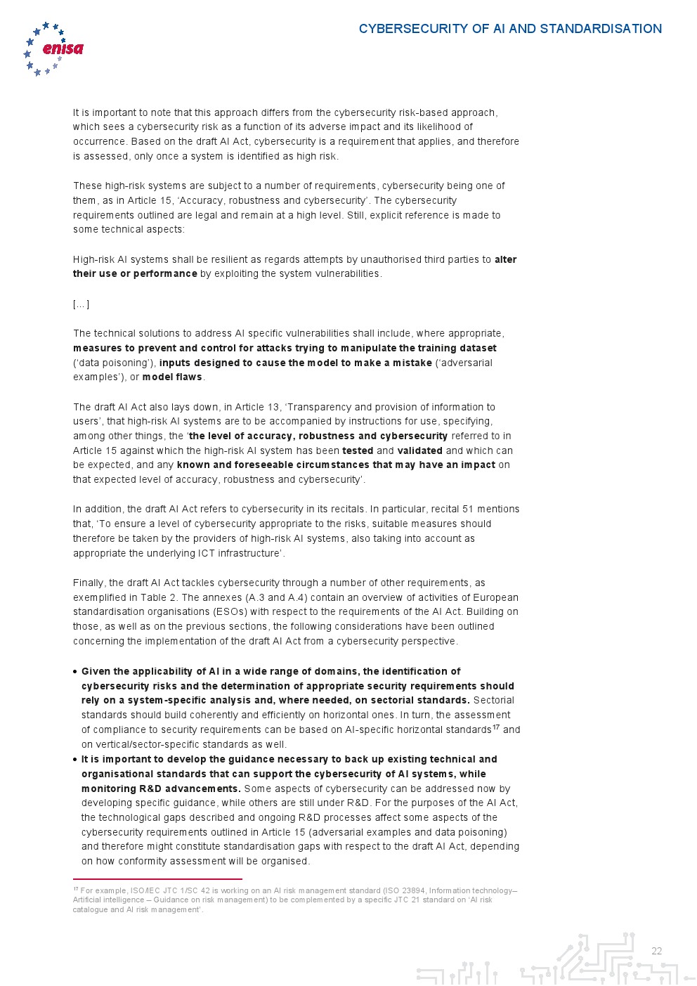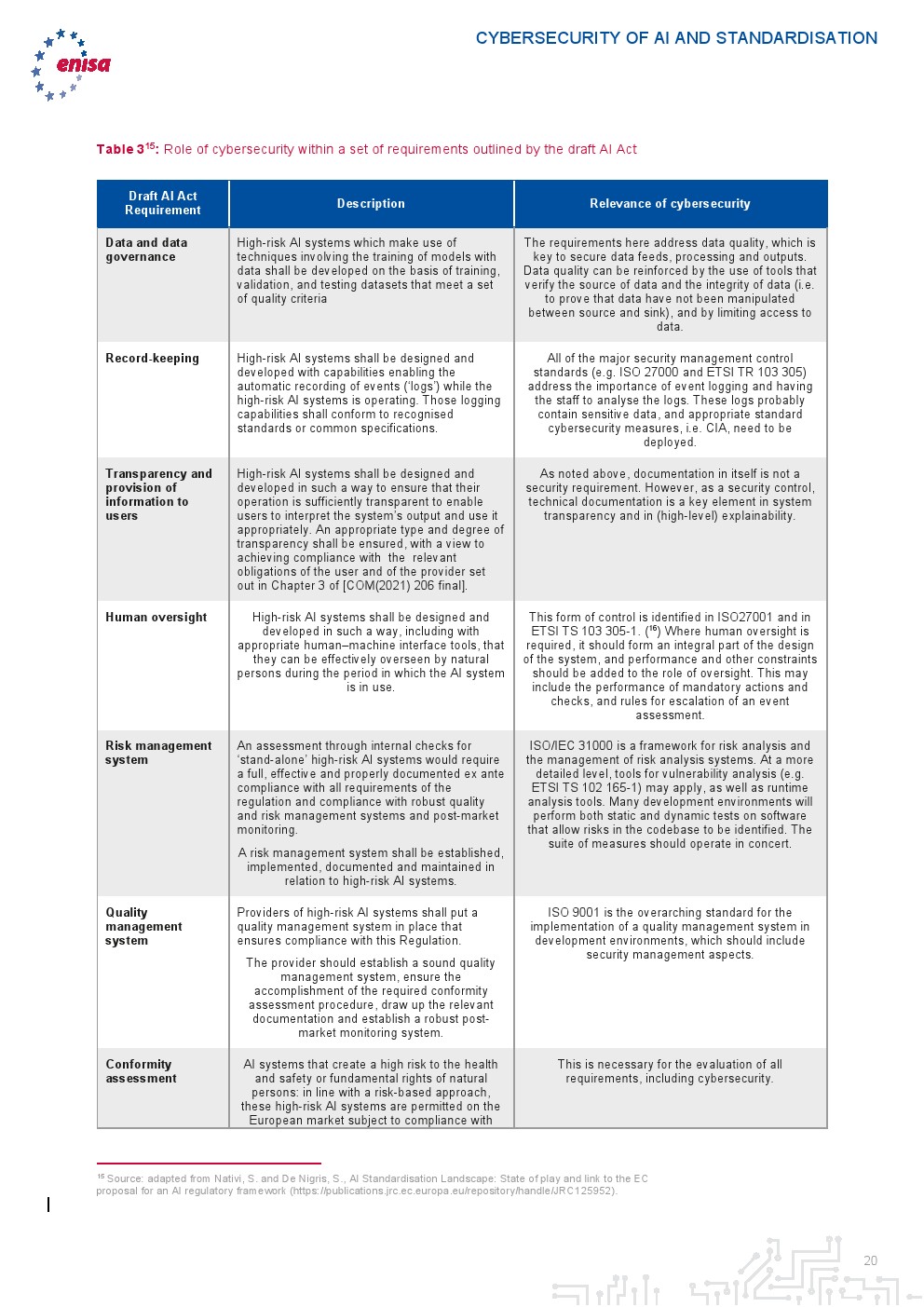 最后,报告通过将分析扩展到人工智能法案草案来补充上述观察结果。首先,报告强调了将网络安全纳入高风险系统评估的重要性,以确定每个系统特定用途的网络安全风险。其次,报告强调缺乏涵盖执行合格评定行为者的能力和工具的标准。第三,人工智能法案草案和网络安全法(CSA)制定的治理体系应协调一致,以避免国家层面的重复努力。
