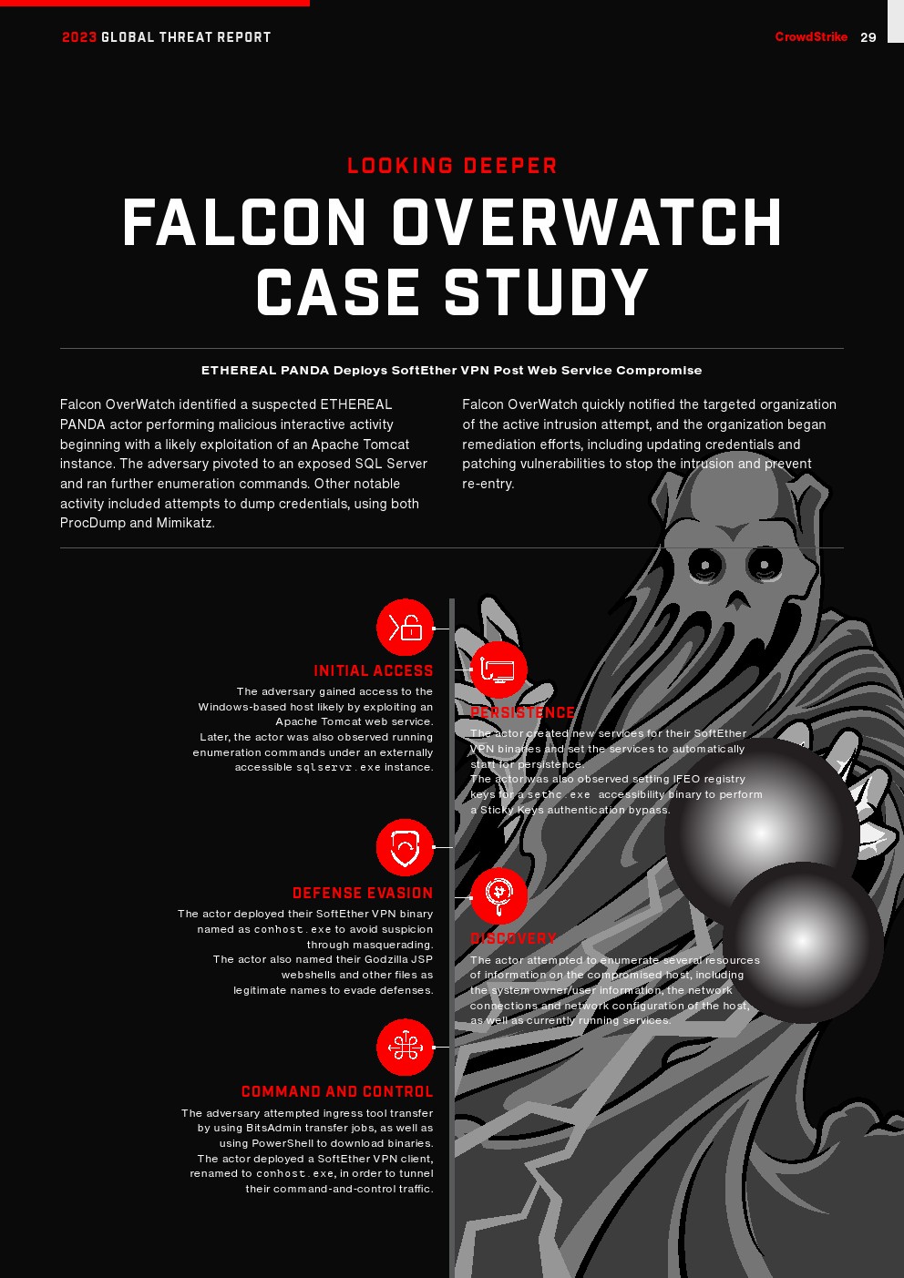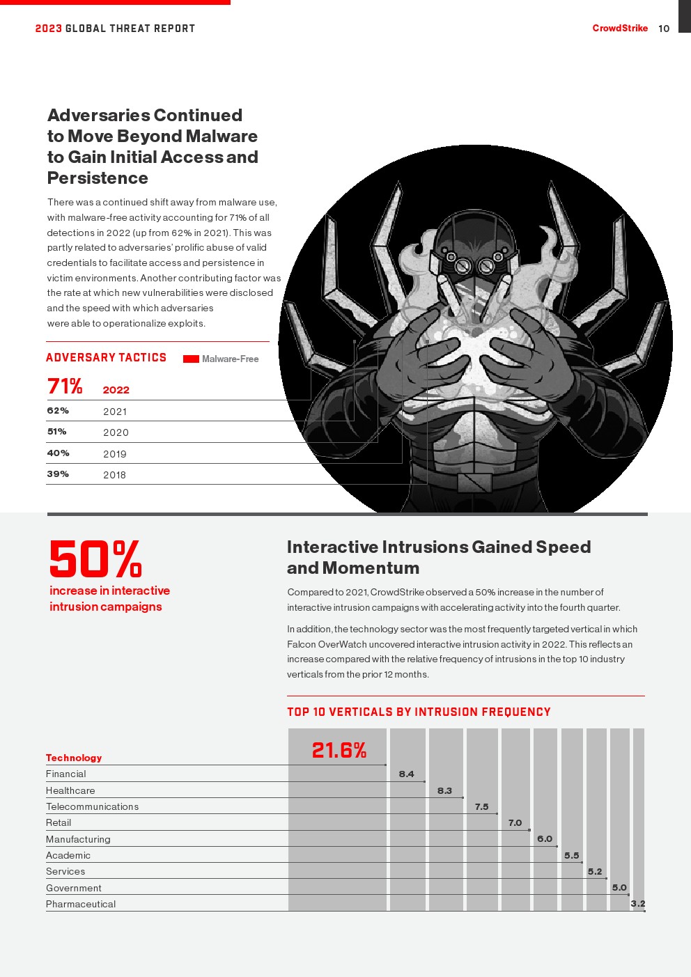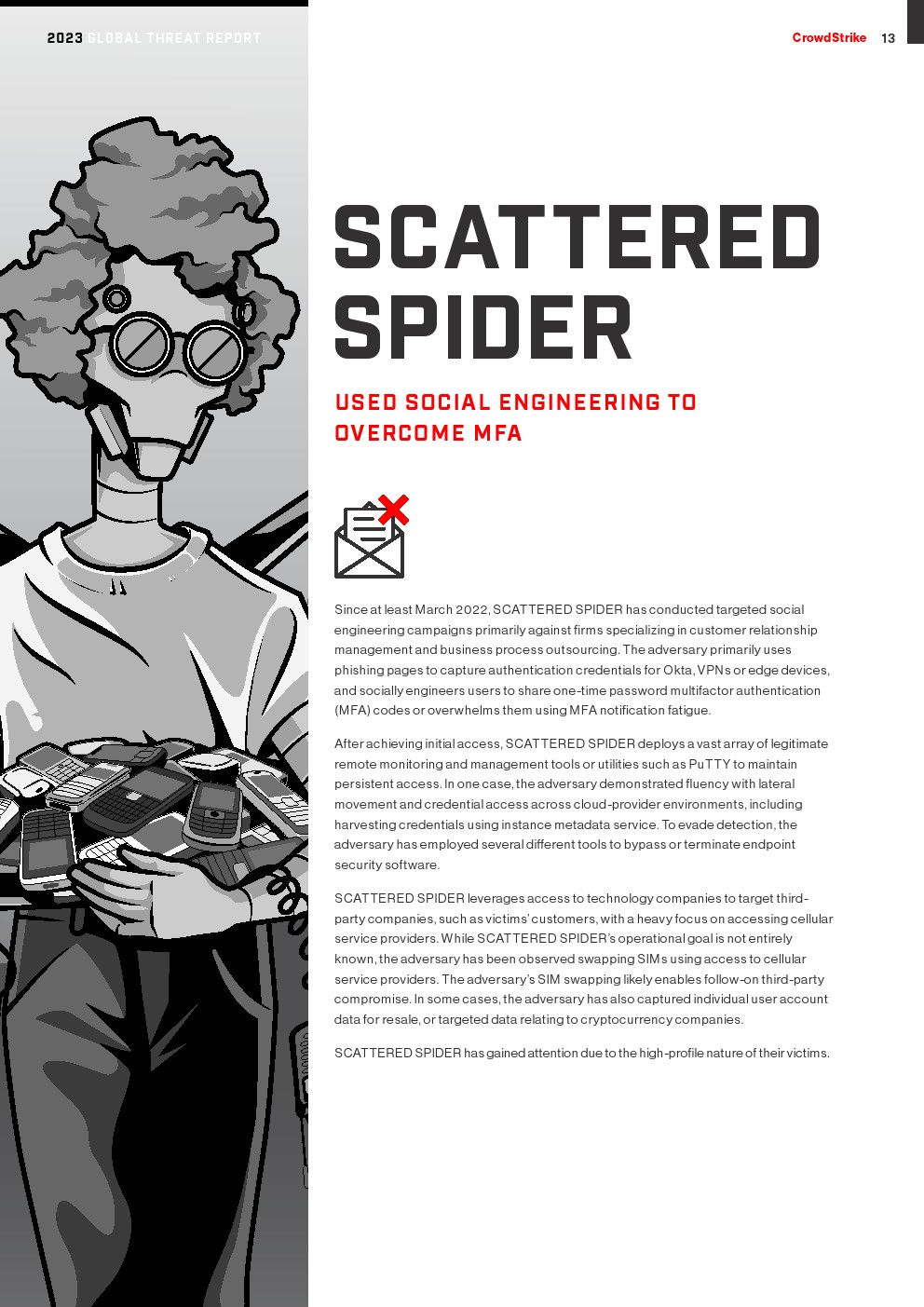 CrowdStrike Intelligence还观察到,利用人际互动(如钓鱼)成功下载恶意软件或绕过多因素身份验证(MFA)的社交工程有所增加,这证明与受害者的直接互动仍然是电子犯罪行动的宝贵资产。